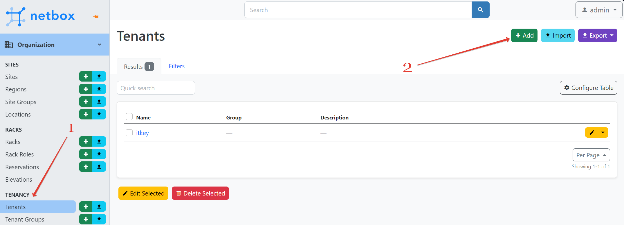 Откройте разделы в следующем порядке: Organization → Tenancy → Tenant. Добавьте тенанта.