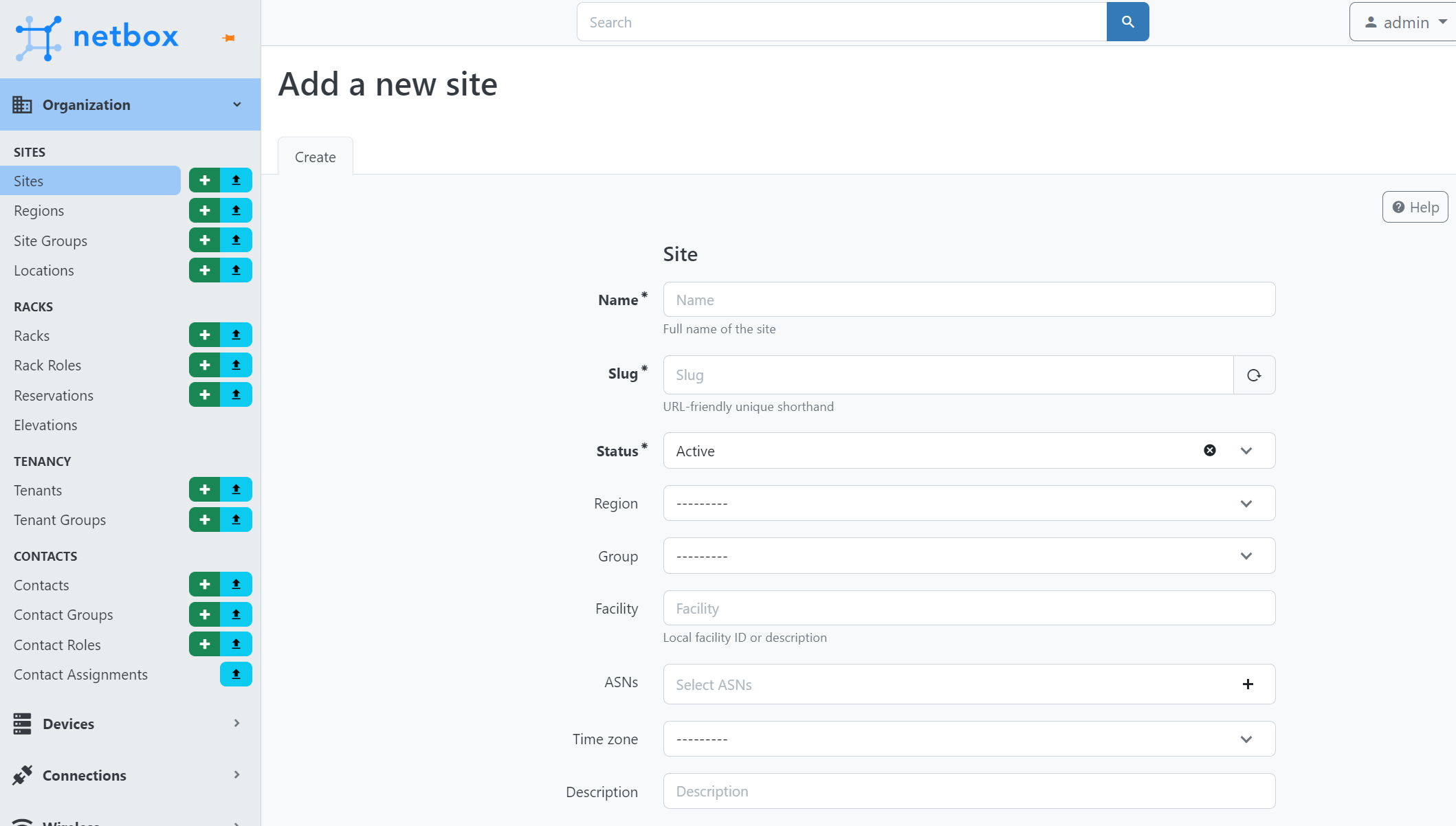 Создайте сайт в Organization → Sites → Sites. Сайты здесь — основная сущность. При создании сайта выберите, к какому региону он относится, в какой группе состоит и какому пользователю принадлежит.