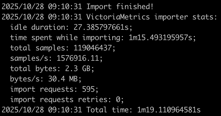 $ ./vmctl-prod prometheus --prom-snapshot=/var/lib/containers/storage/volumes/prometheus/_data/snapshots/20251028T074306Z-4e5c23eb571201c1/ --vm-addr=http://10.224.133.216:8480 --vm-account-id=0 --vm-user=admin --vm-password=<password>