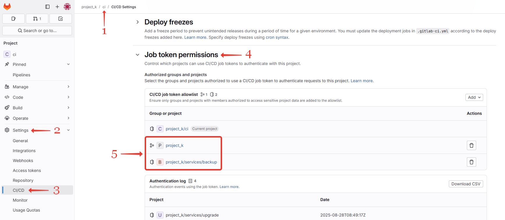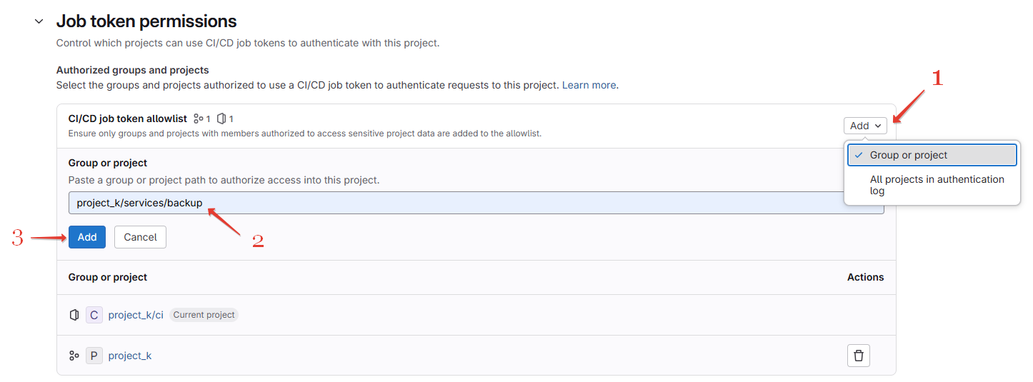 В разделе CI/CD перейдите в Job token permissions и убедитесь, что в списке CI/CD job token allowlist присутствует репозиторий project_k / services / backup или группа project_k.