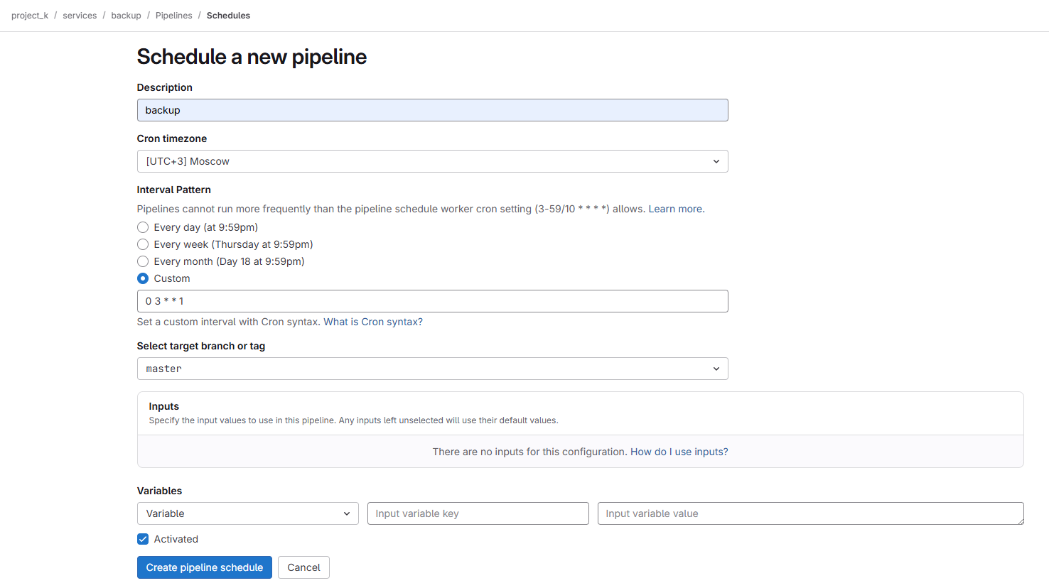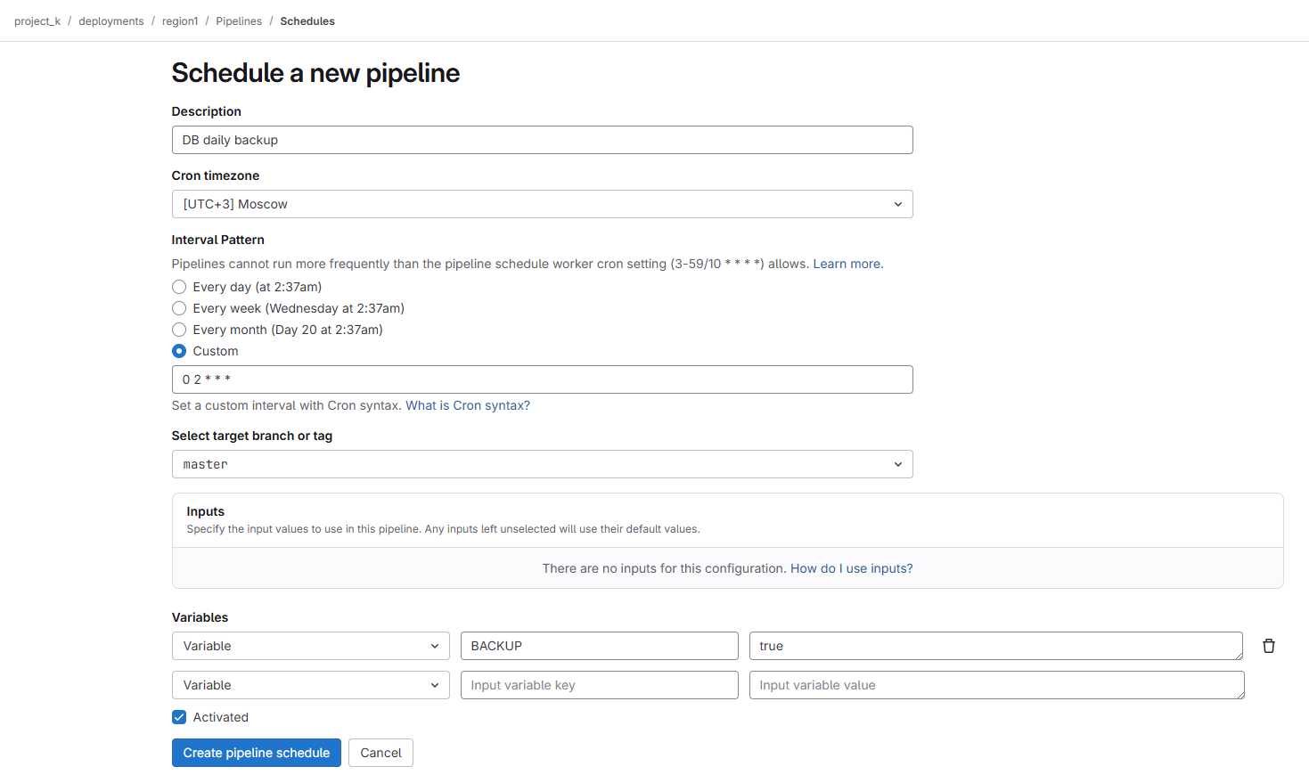 Также вы можете настроить регулярное выполнение резервного копирования с помощью функции Pipeline Schedules. Для настройки выполните следующие действия: