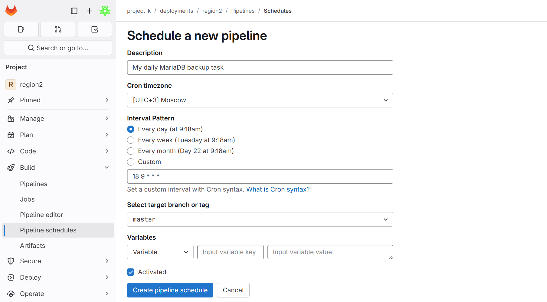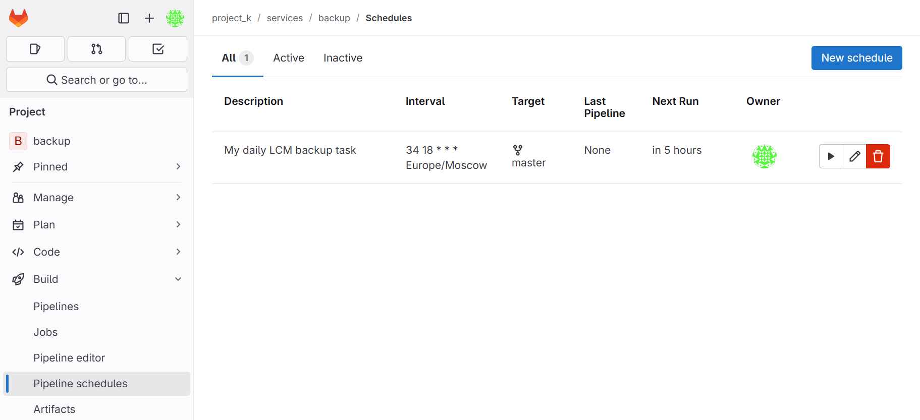 Также вы можете запланировать регулярное выполнение резервного копирования с помощью функции Pipeline schedules. Для этого просто создайте расписание с запуском пайплайна по умолчанию.