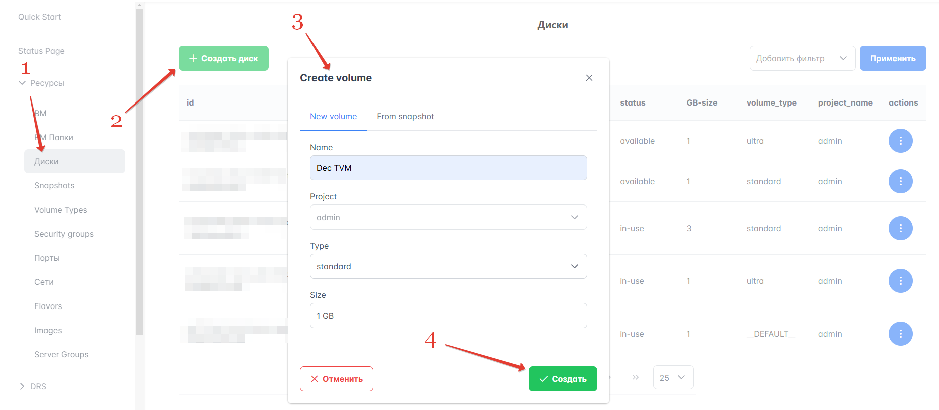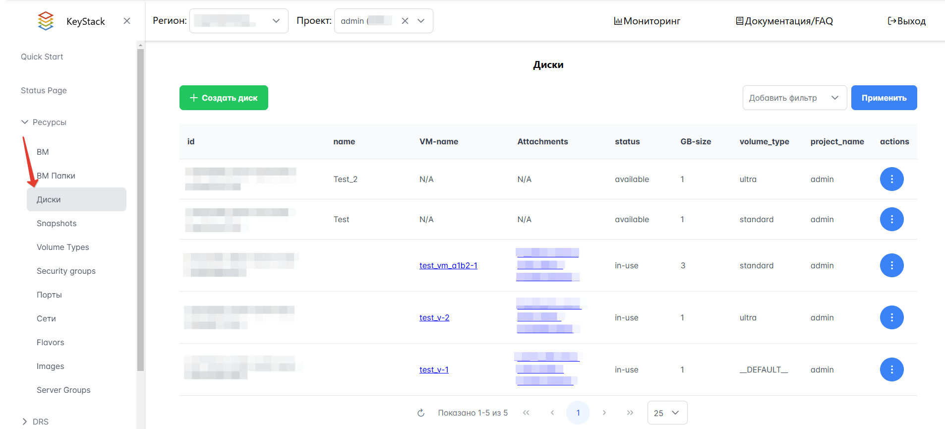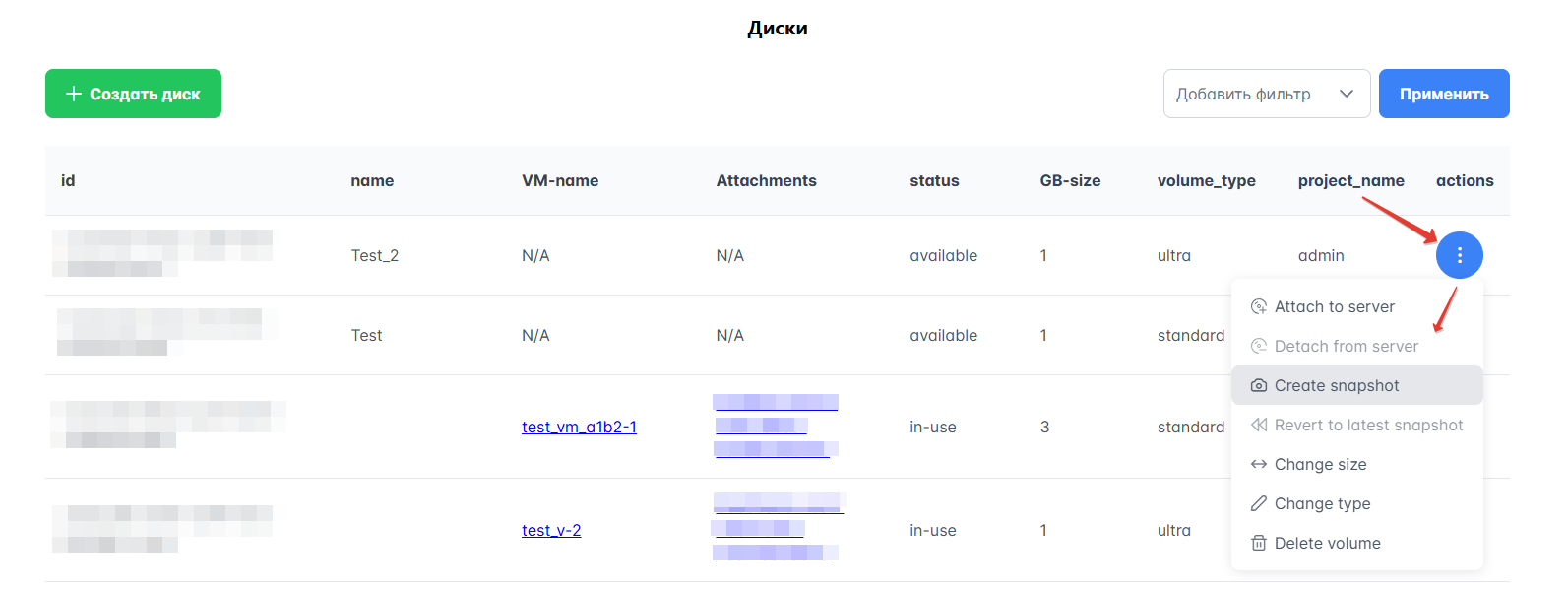 NeverнаOn demandв Migrate the volume when it is re-typed. Нажмите Применить.Если диск не прикреплен к ВМ, нажмите Attach to server. В открывшемся окне выберите ВМ в поле Сервер. Чтобы при удалении ВМ был удален и этот диск, выберите опцию Delete on termination. Нажмите Прикрепить.