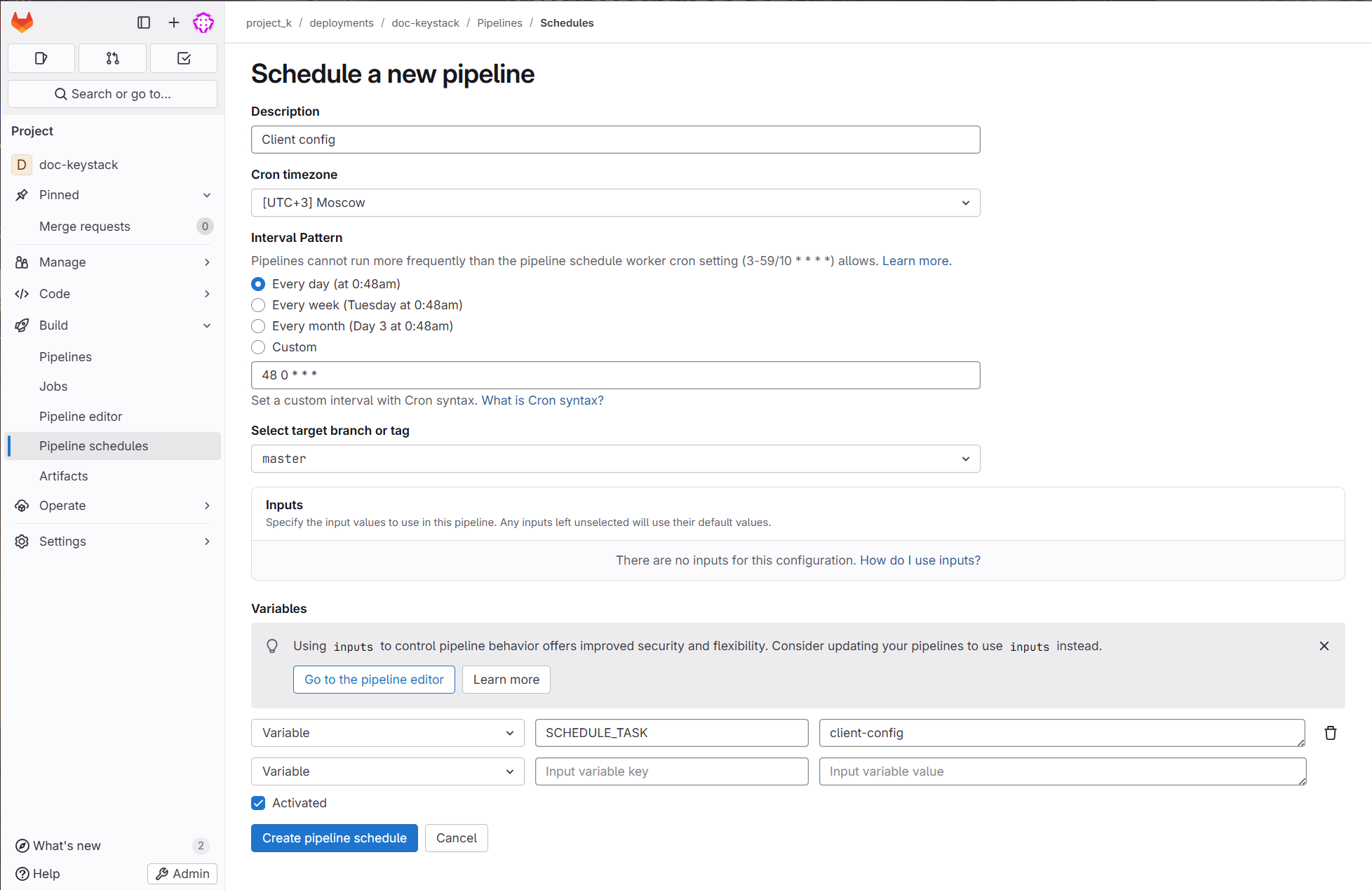 Также вы можете настроить регулярное выполнение задачи client-config с помощью функции Pipeline Schedules. Для этого выполните следующие действия: