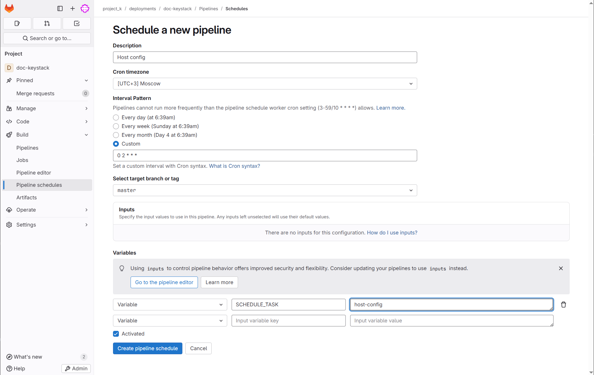 Также вы можете настроить регулярное выполнение задач host-config с помощью Pipeline Schedules. Для этого выполните следующие действия: