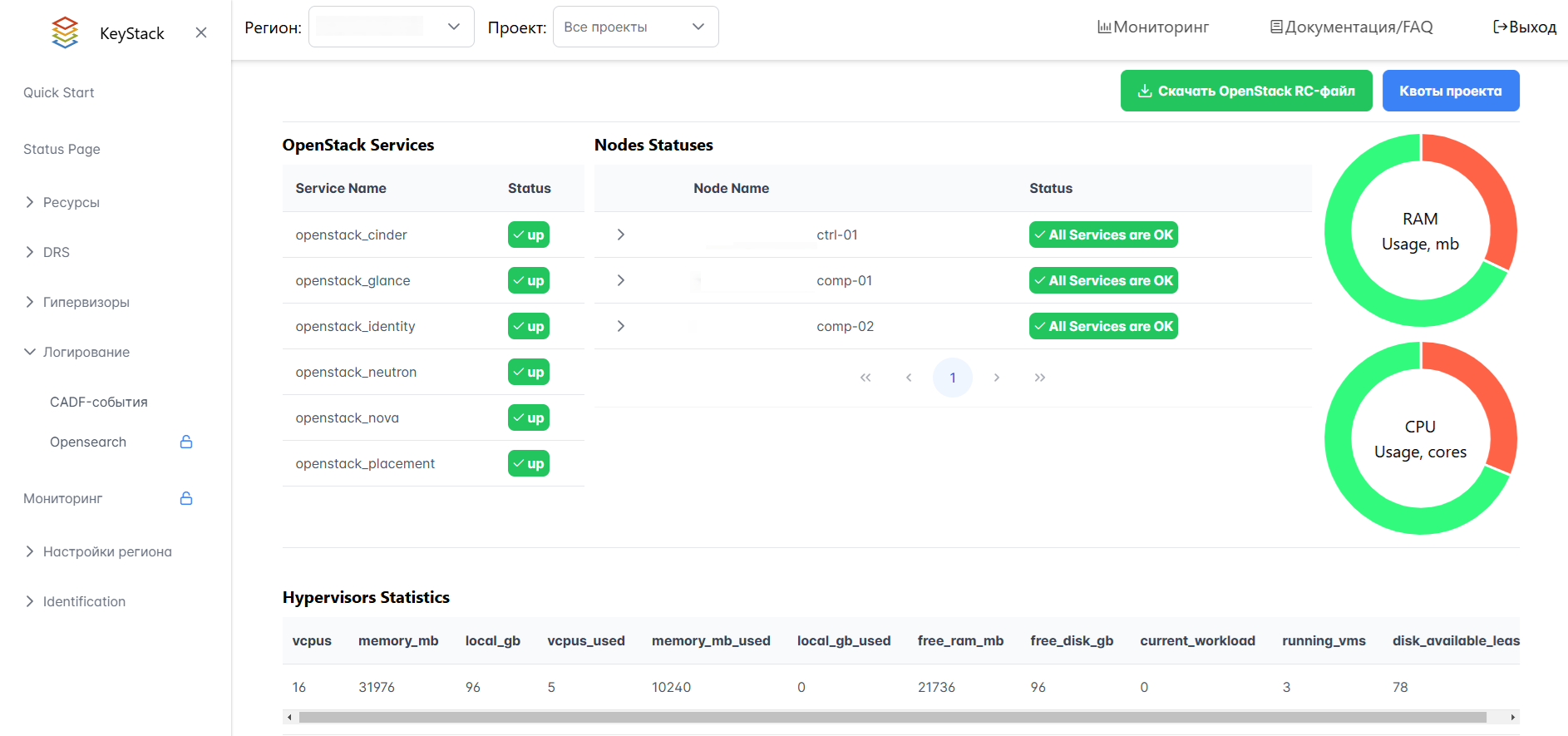 Стартовая страница интерфейса Status Page — обзор вычислительных ресурсов. Вы можете переходить к другим разделам интерфейса управления с помощью бокового меню.