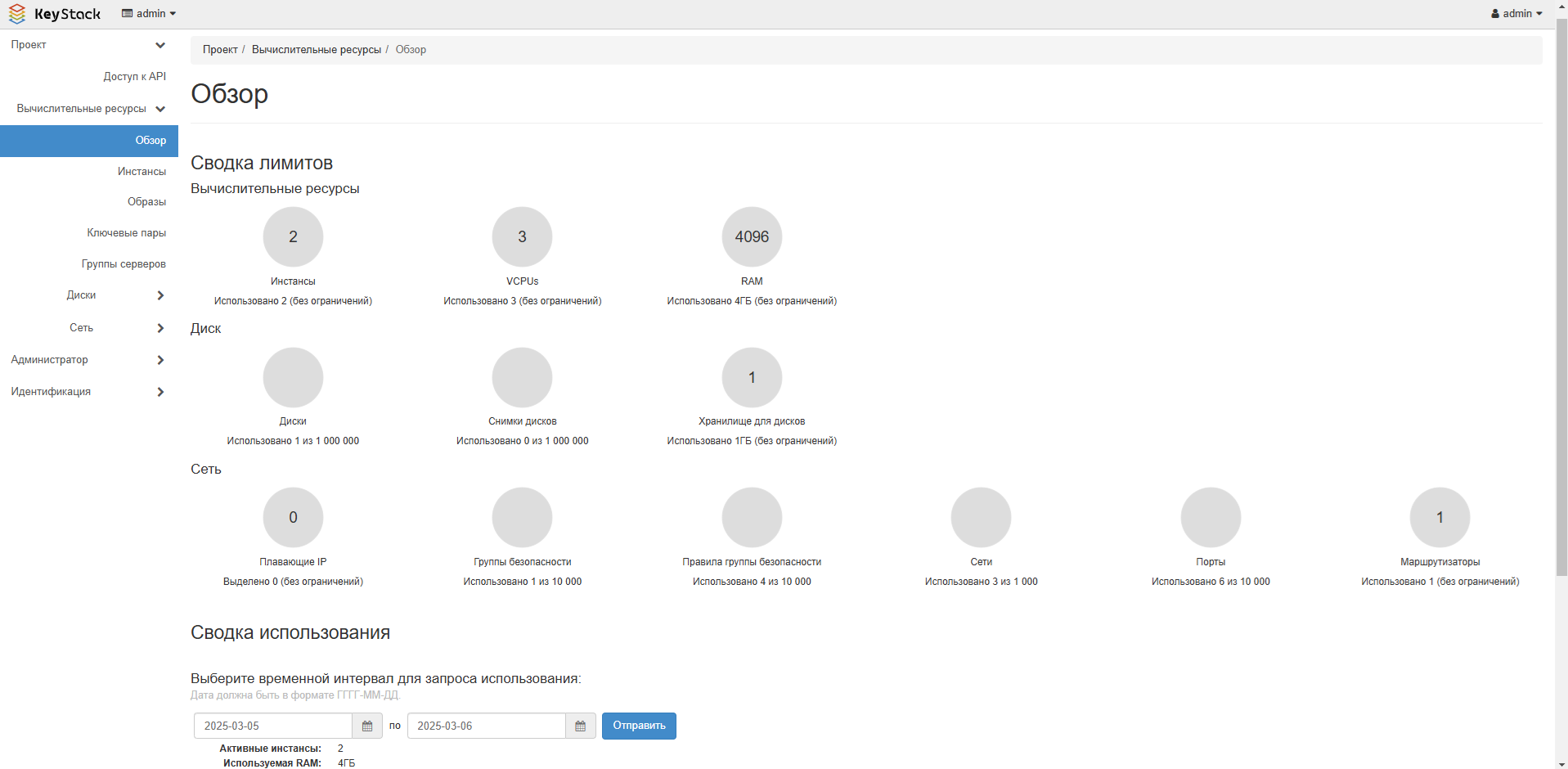 По умолчанию стартовая страница интерфейса — обзор вычислительных ресурсов (). Вы можете переходить к другим разделам интерфейса управления Платформы с помощью бокового меню.
