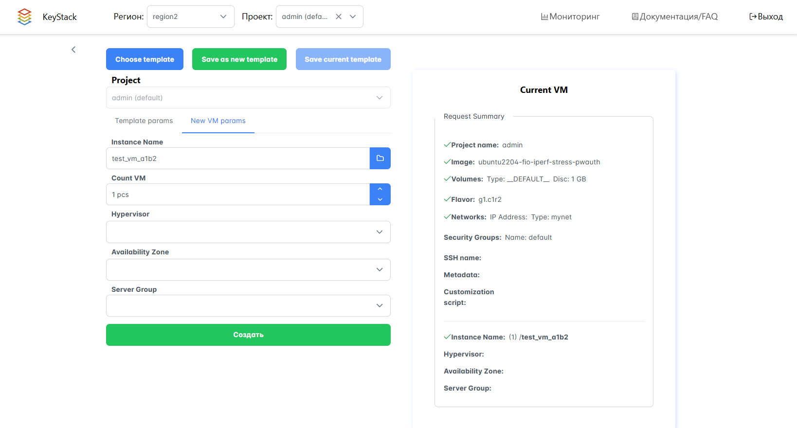 Укажите параметры на вкладке New VM params и нажмите Создать.