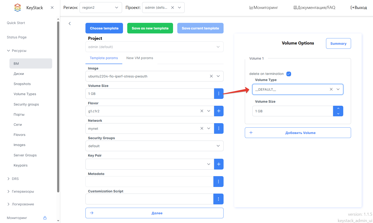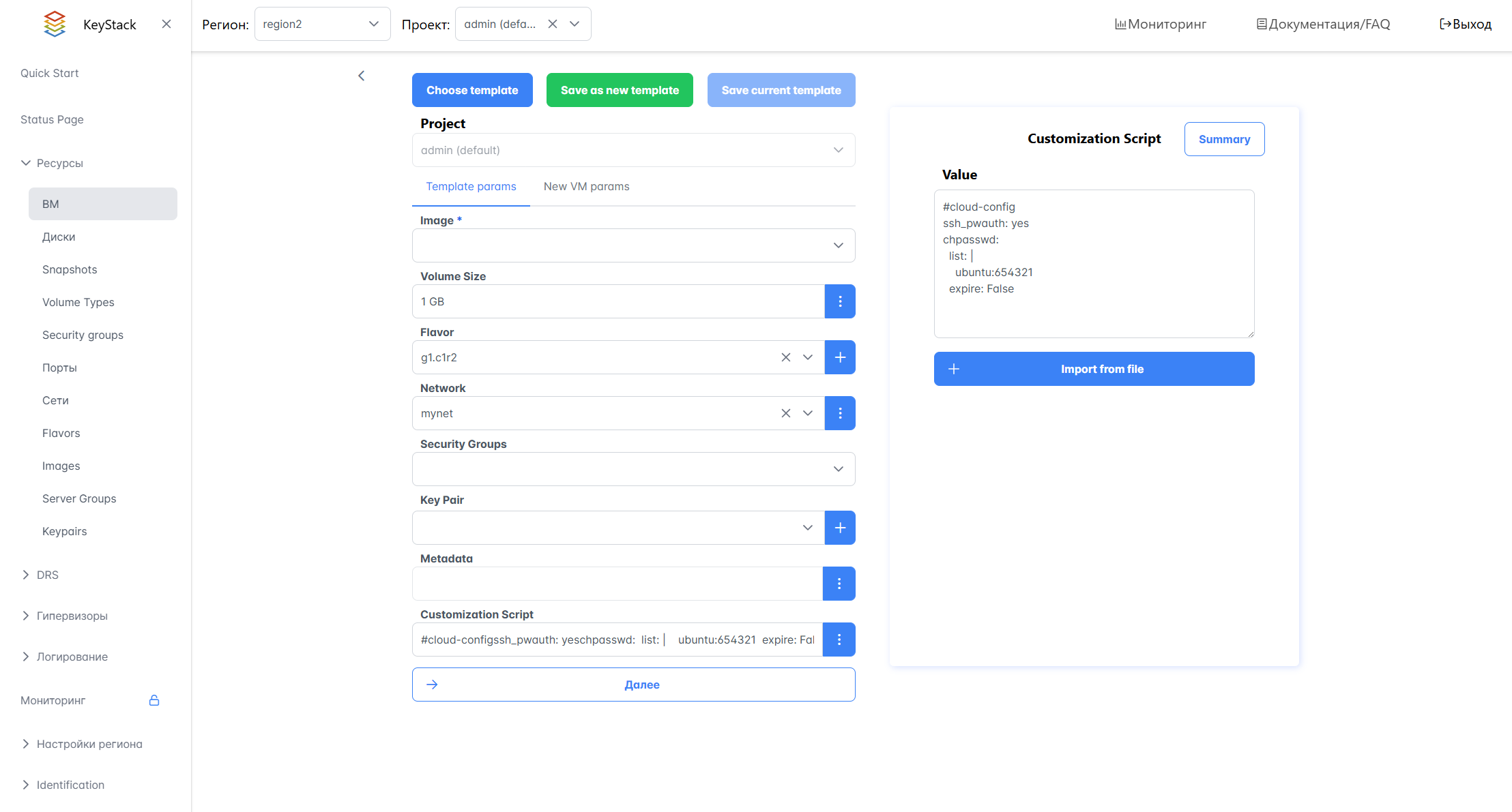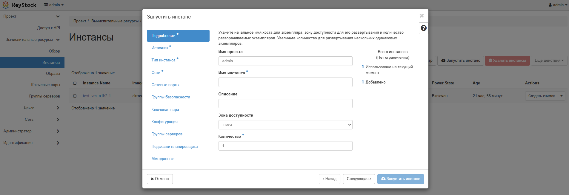 В форме Создание нового инстанса укажите параметры создаваемой ВМ: