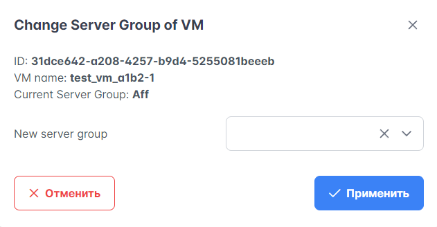 В открывшемся окне заполните поле New server group. Чтобы добавить ВМ в группу, выберите эту группу из выпадающего списка. Чтобы удалить ВМ из группы, нажмите значок X и оставьте поле пустым. Текущая группа ВМ отображается в поле Current Server Group.
