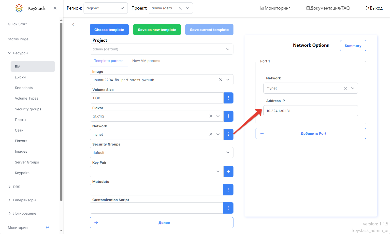 Network — укажите сеть, в которой будет доступна ВМ из списка сетей;
