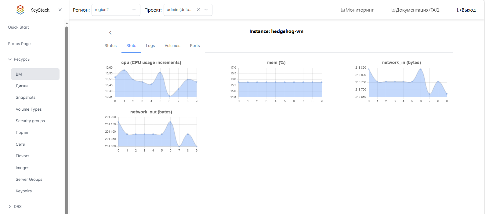 Вы можете просматривать потребление ресурсов виртуальных машин в интерфейсе Портала администратора. На странице каждой ВМ доступны графики со статистикой по таким показателям, как CPU (cpu), память (mem), входящий и исходящий трафик сети (network_in и network_out). Статистика обновляется каждые 10 минут.