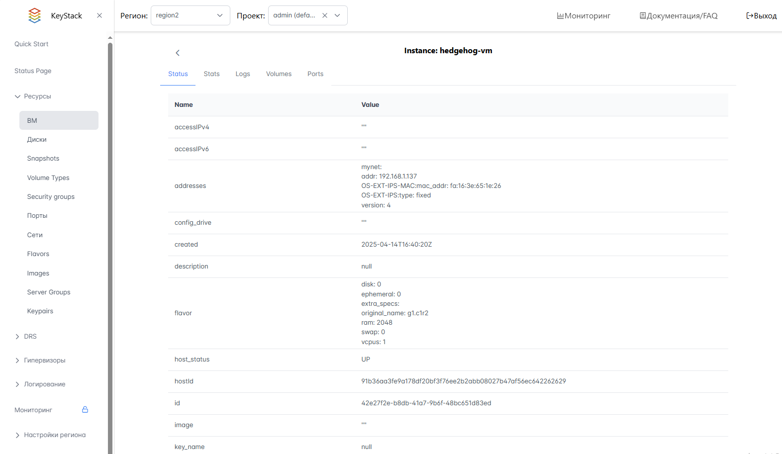 На странице каждой ВМ доступен просмотр диагностической информации: