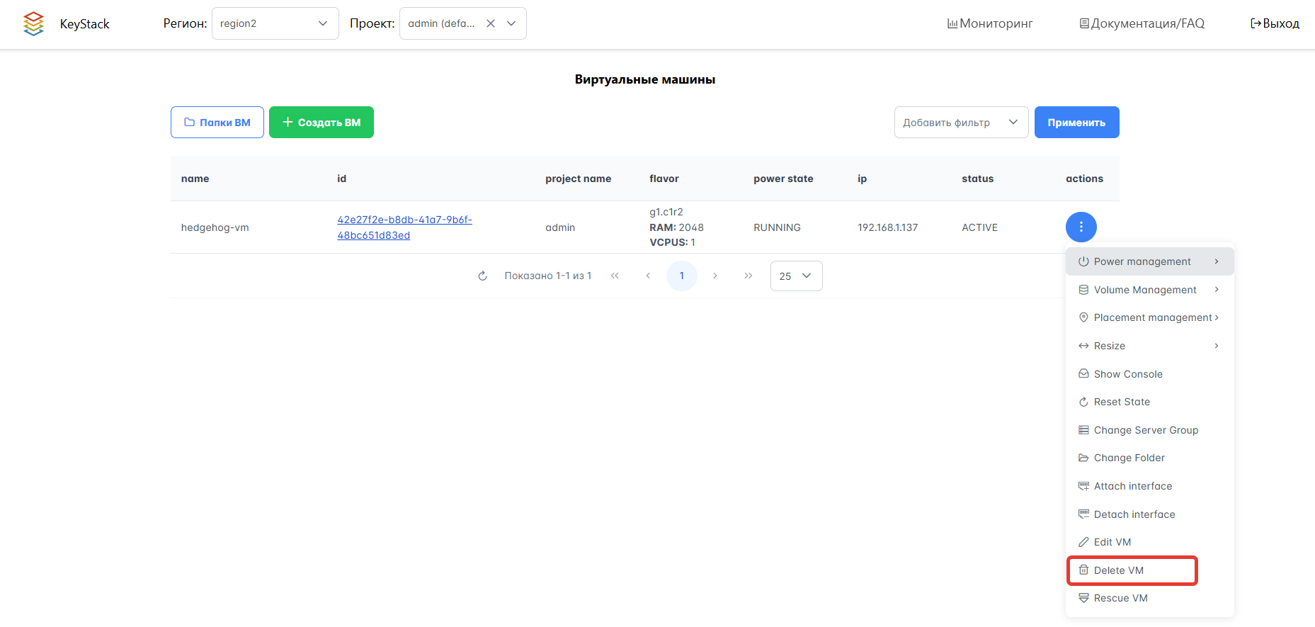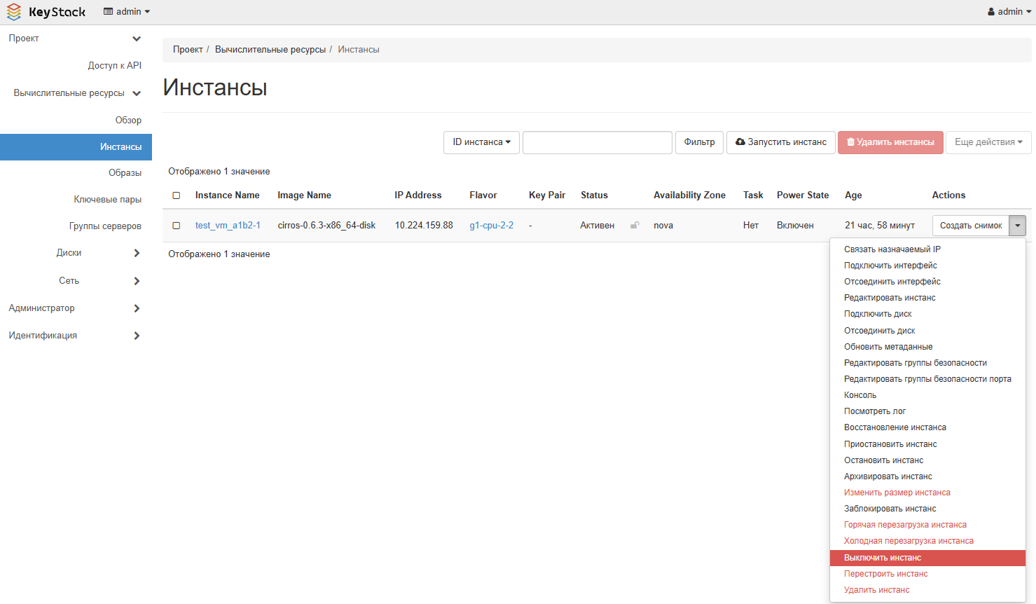 В списке ВМ в столбце Actions выберите действие Включить инстанс, Выключить инстанс, Горячая перезагрузка инстанса или Холодная перезагрузка инстанса.