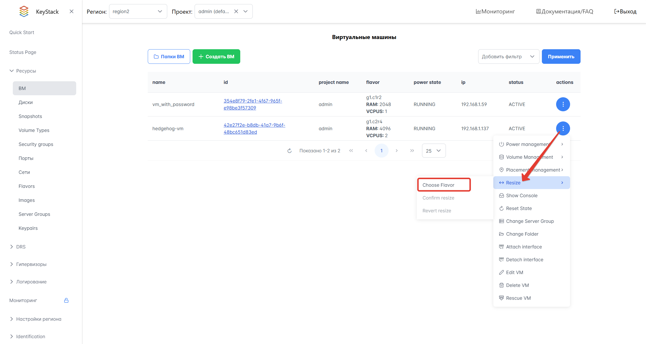 В списке ВМ в столбце actions выберите действие Resize > Choose Flavor.