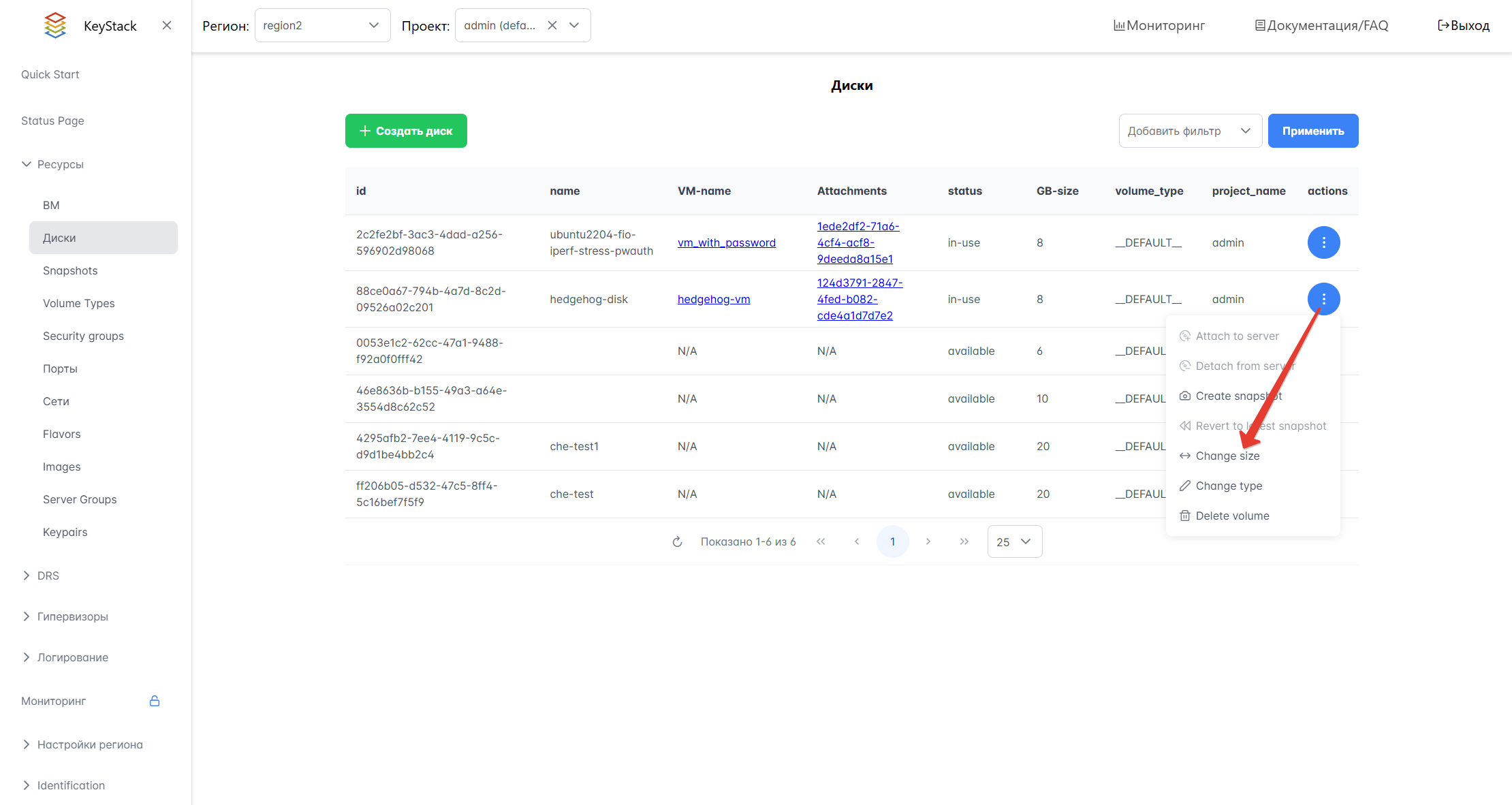 В списке дисков в столбце actions выберите действие Change size.