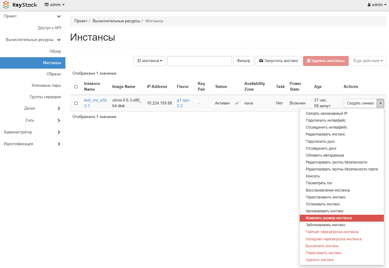 Для изменения ресурсов ВМ на портале самообслуживания Horizon выберите Вычислительные ресурсы > Инстансы в левом меню, далее найдите ВМ, ресурсы которой необходимо изменить, и выберите в контекстном меню Изменить размер инстанса.