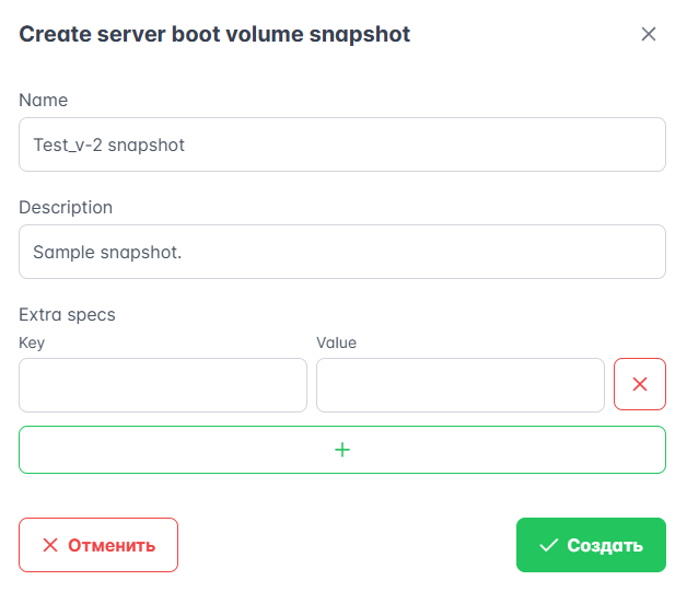 В открывшемся окне укажите имя и название снимка ВМ. Чтобы добавить дополнительные параметры, нажмите + для Extra specs. Нажмите Создать.