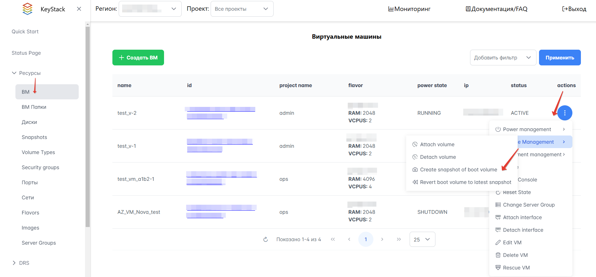Нажмите выпадающий список в столбце Actions и выберите Volume management, а затем Revert boot volume to latest snapshot.