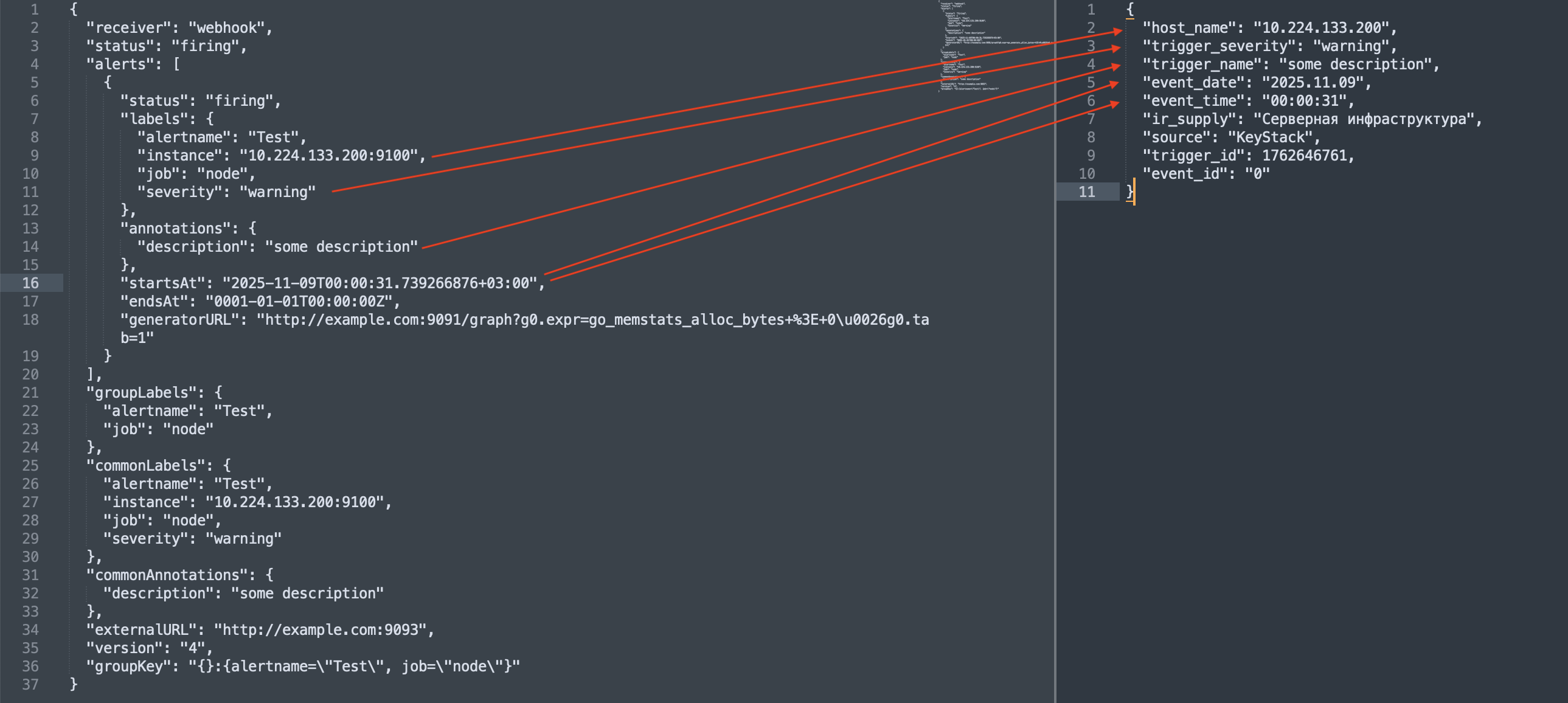 {"version":"4","groupKey":<string>,// key identifying the group of alerts (e.g. to deduplicate)"truncatedAlerts":<int>,// how many alerts have been truncated due to "max_alerts""status":"<resolved|firing>","receiver":<string>,"groupLabels":<object>,"commonLabels":<object>,"commonAnnotations":<object>,"externalURL":<string>,// backlink to the Alertmanager."alerts":[{"status":"<resolved|firing>","labels":<object>,"annotations":<object>,"startsAt":"<rfc3339>","endsAt":"<rfc3339>","generatorURL":<string>,// identifies the entity that caused the alert"fingerprint":<string>// fingerprint to identify the alert},...]}