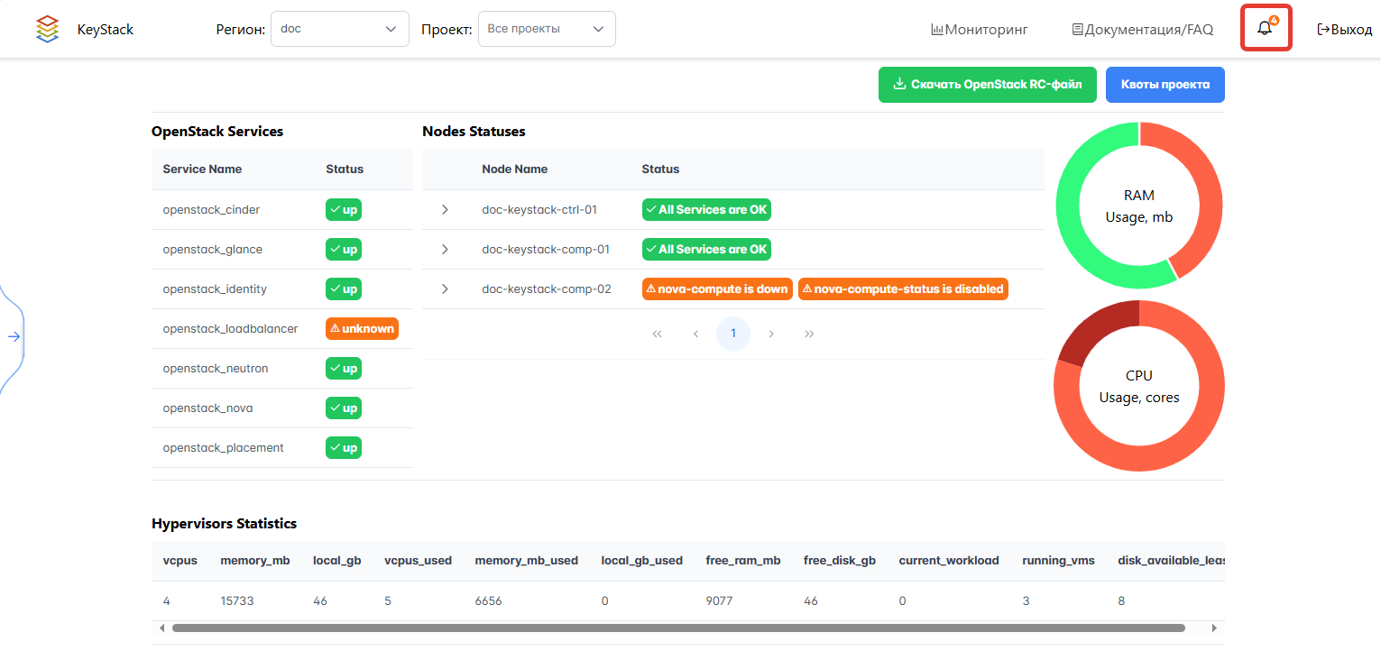 На Портале администратора предусмотрено отображение активных уведомлений из Alertmanager уровня warning и critical.