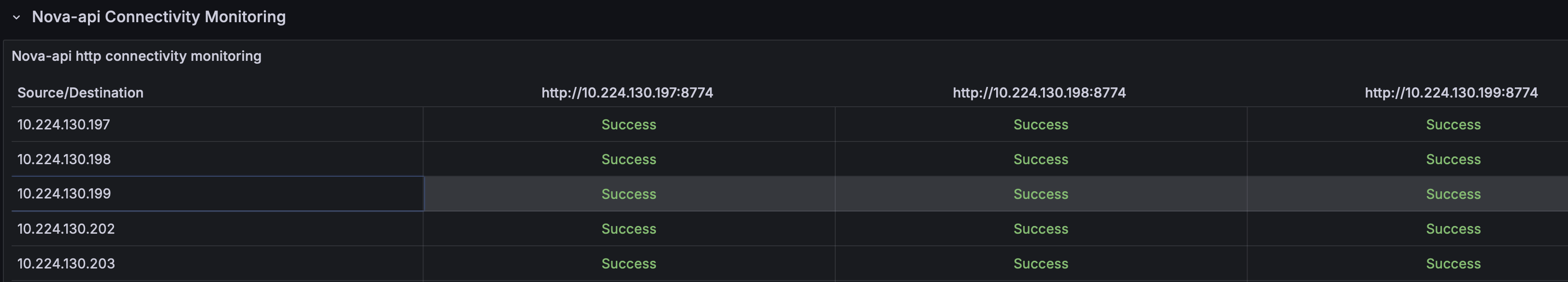 В случаях нарушения сетевой связности от вычислительных узлов к управляющим узлам или между управляющими узлами становится невозможным подключение к эндпоинту сервиса nova-api, который располагается на управляющих узлах. В этом случае формируется алерт BlackboxProbeHttpNovaApi. При этом на панели Certificate & Connection Monitoring дашборда KS - SSL Certificate Monitor можно видеть результаты проверок подключения к nova-api.