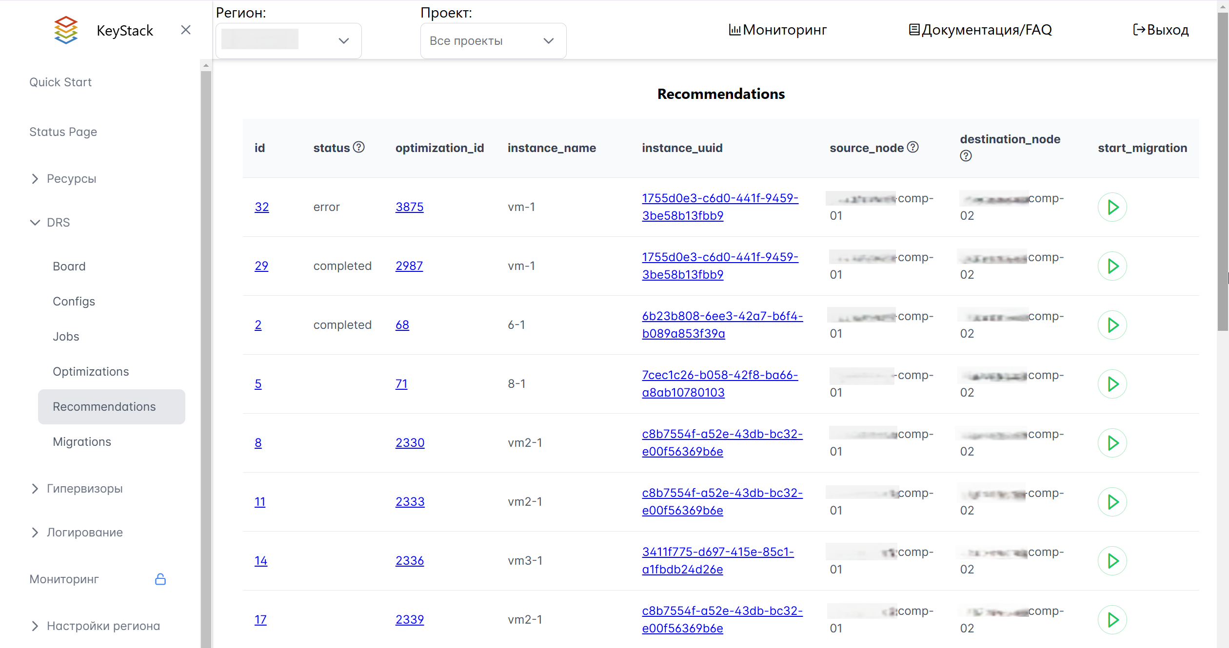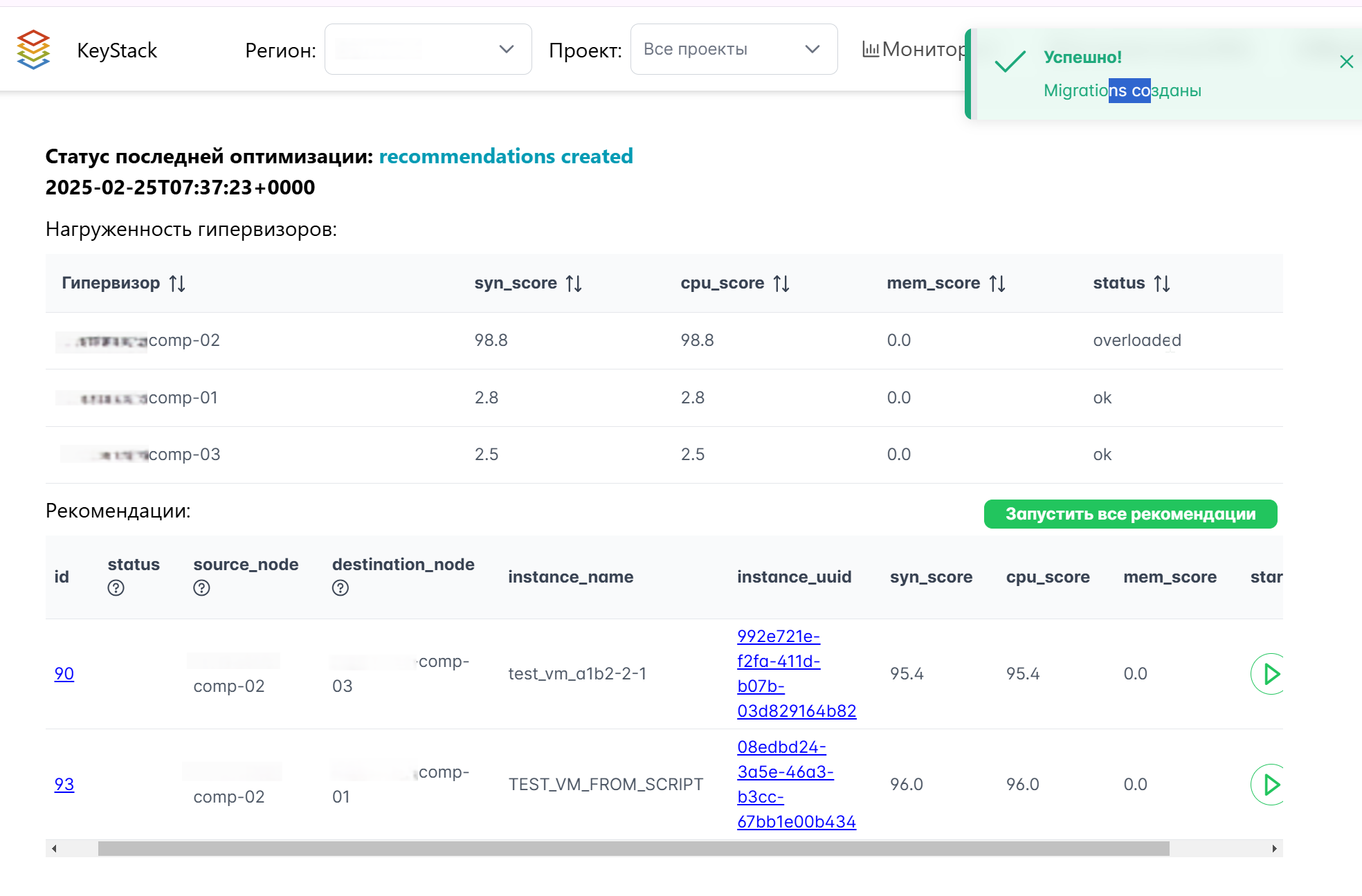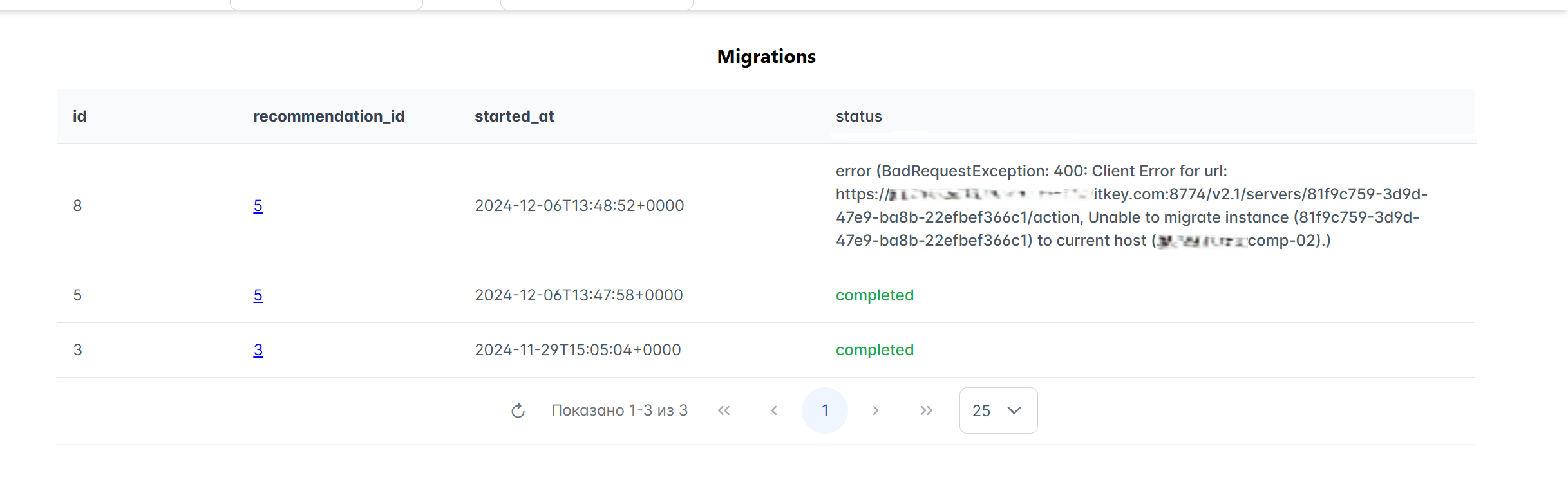 Чтобы запустить миграцию по отдельной рекомендации, нажмите кнопку start_migration в соответствующей строке таблицы.