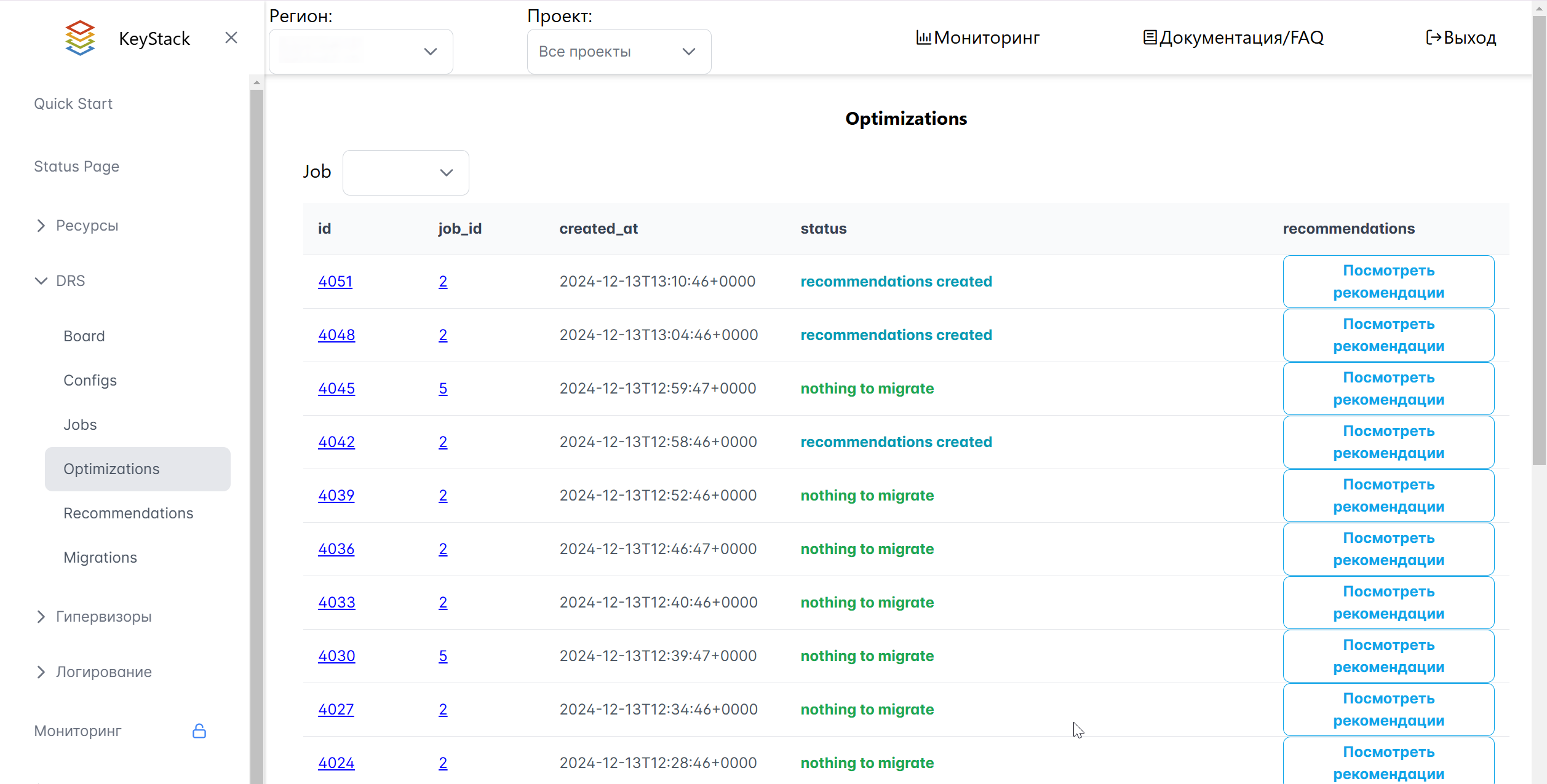 Всю информацию по оптимизациям (ID оптимизации, ID связанного задания, время создания и статус) можно посмотреть в разделе .