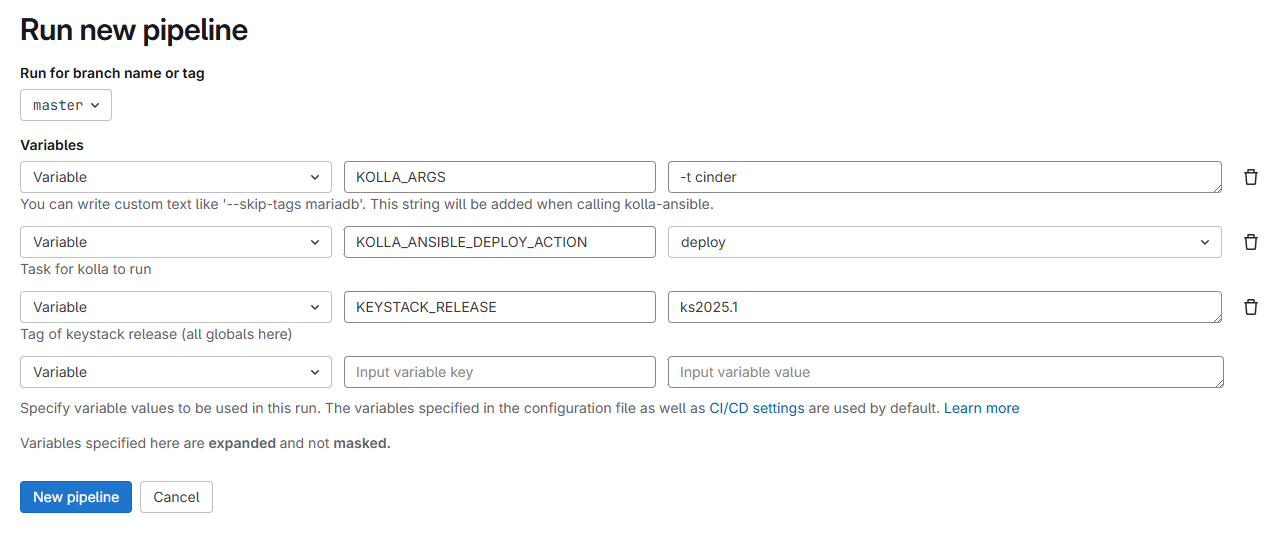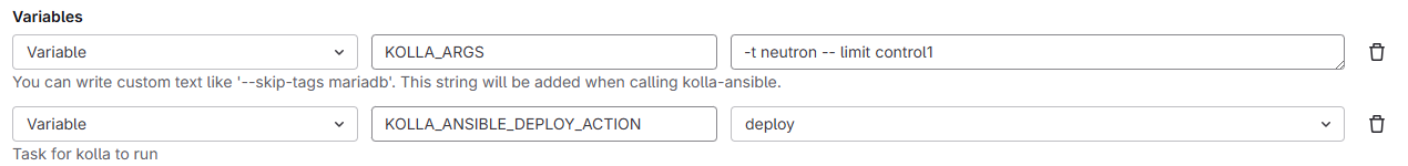 KOLLA_ARGS— укажите тег компонента, который необходимо развернуть и серверы для развёртывания. Например, для Cinder укажите-t cinder, а для первого Control-узла —--limit ctrl01. Можно указать несколько элементов через запятую без пробелов.KOLLA_ANSIBLE_DEPLOY_ACTION— выберитеdeploy.