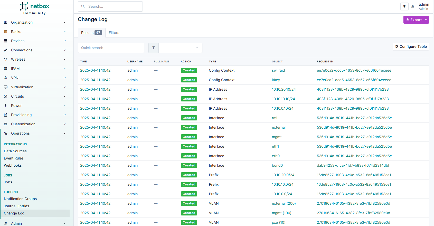 В NetBox всегда можно отследить внесенные изменения (время, автора изменений и т.д.) в разделе Operations > Logging > Change Log.