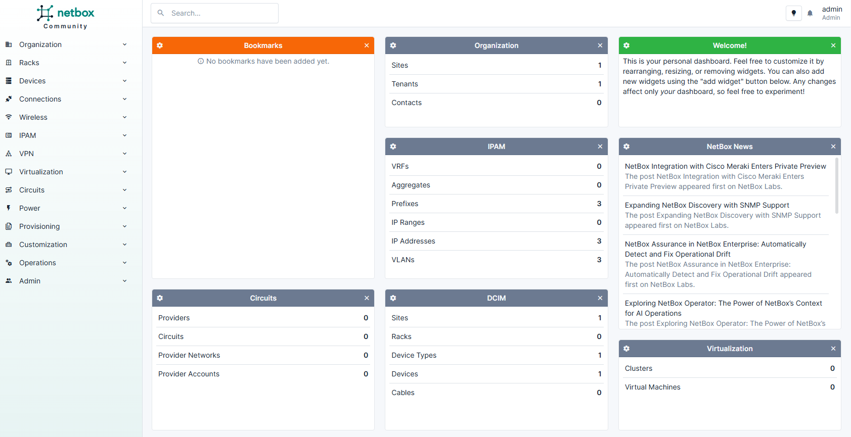 Для базовой настройки сервиса достаточно заполнить следующие разделы: Organization, Customization, IPAM, Provisioning и Devices.