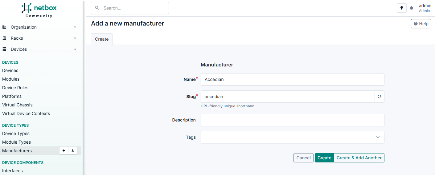 Добавление нового производителя в NetBox