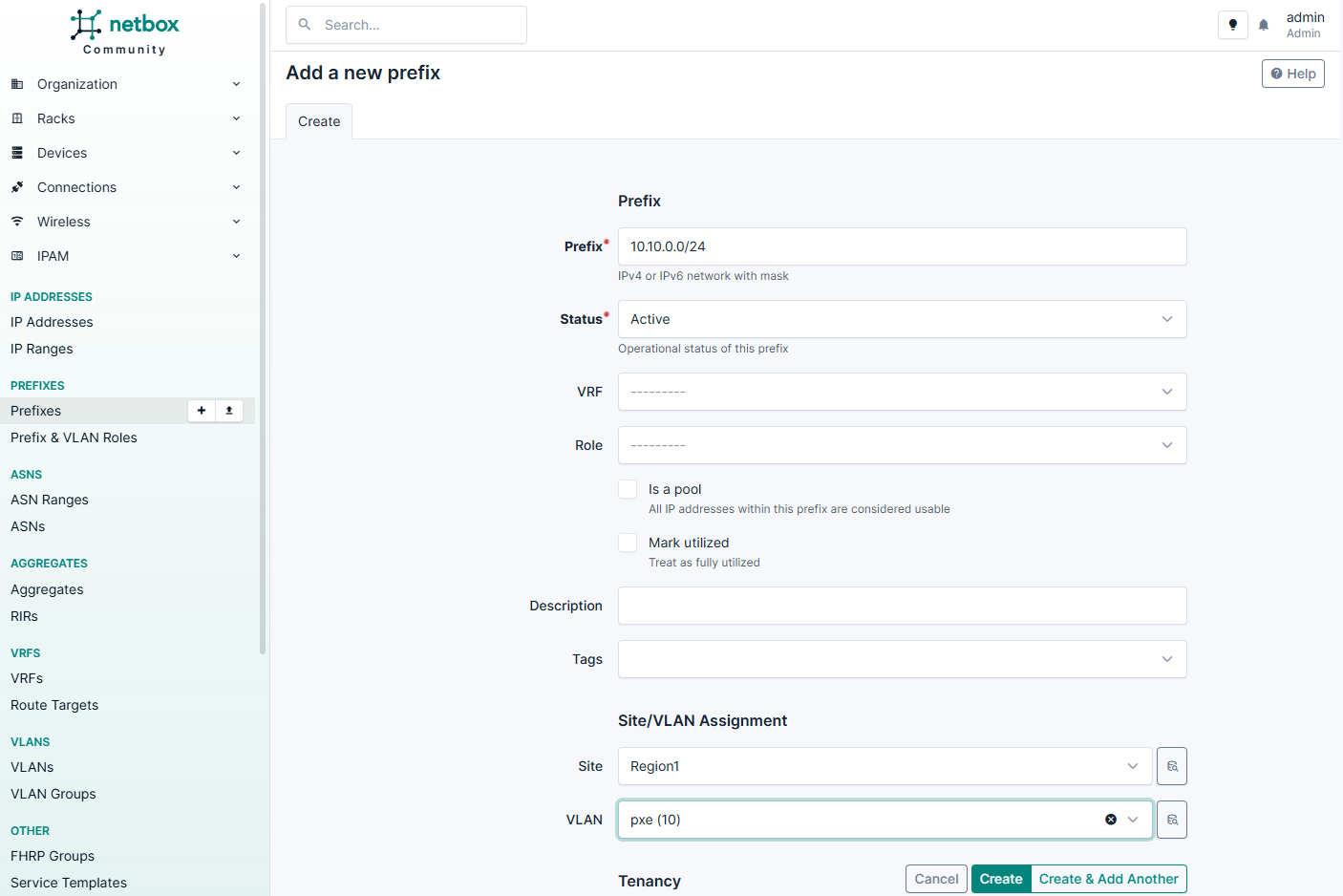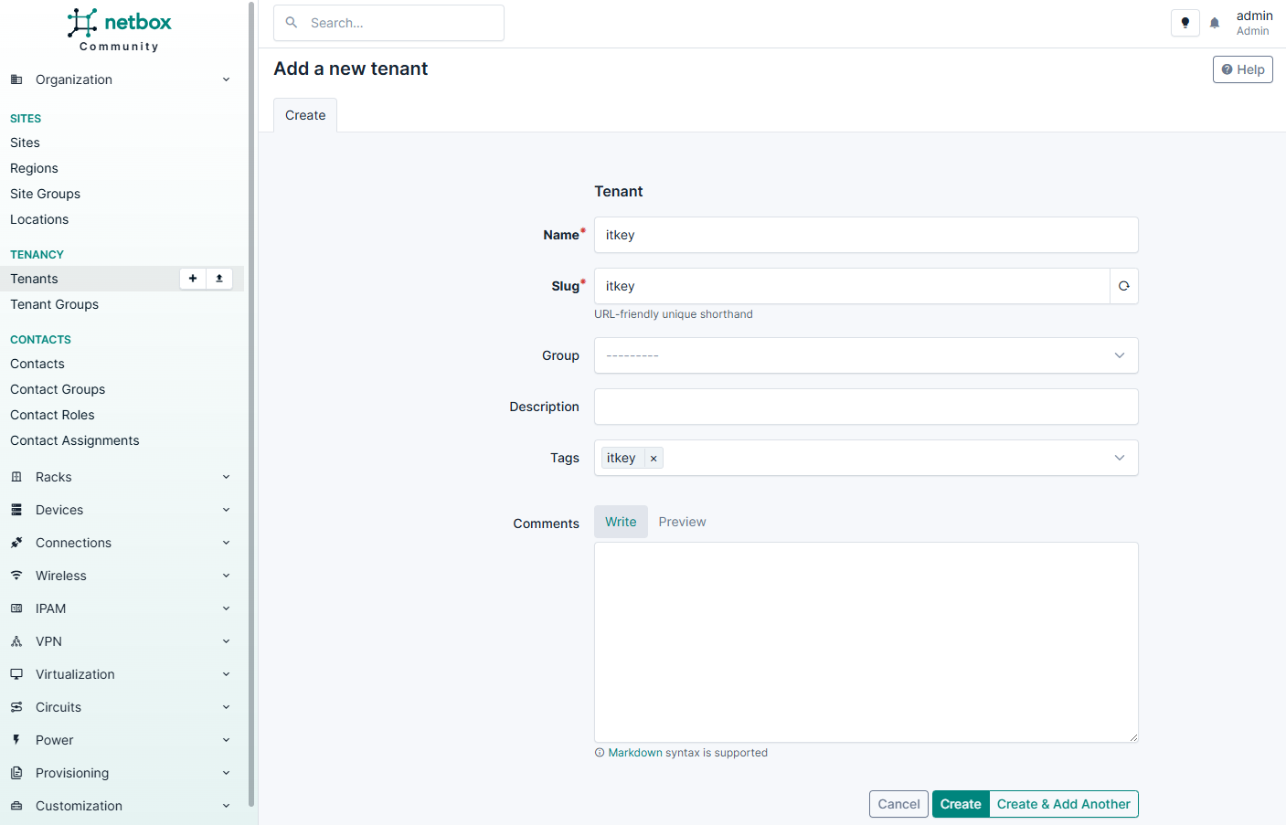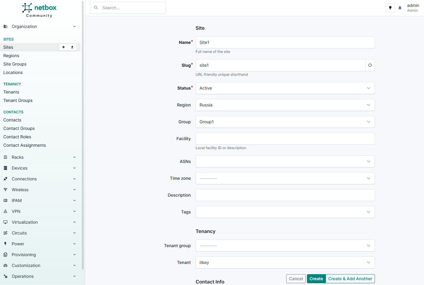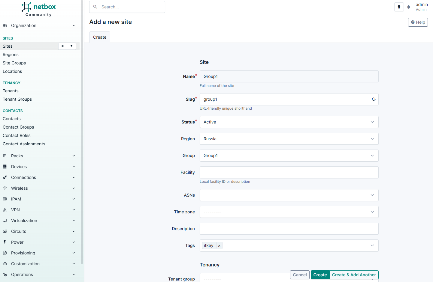 В первую очередь настройте параметры в разделах Sites и Tenancy. Последовательность создания сущностей для работы с NetBox: сайт-группа > регион > сайт.