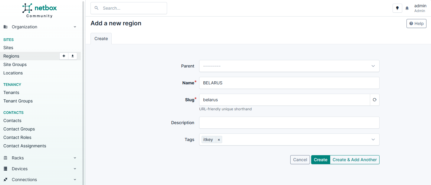 Добавление нового региона в NetBox