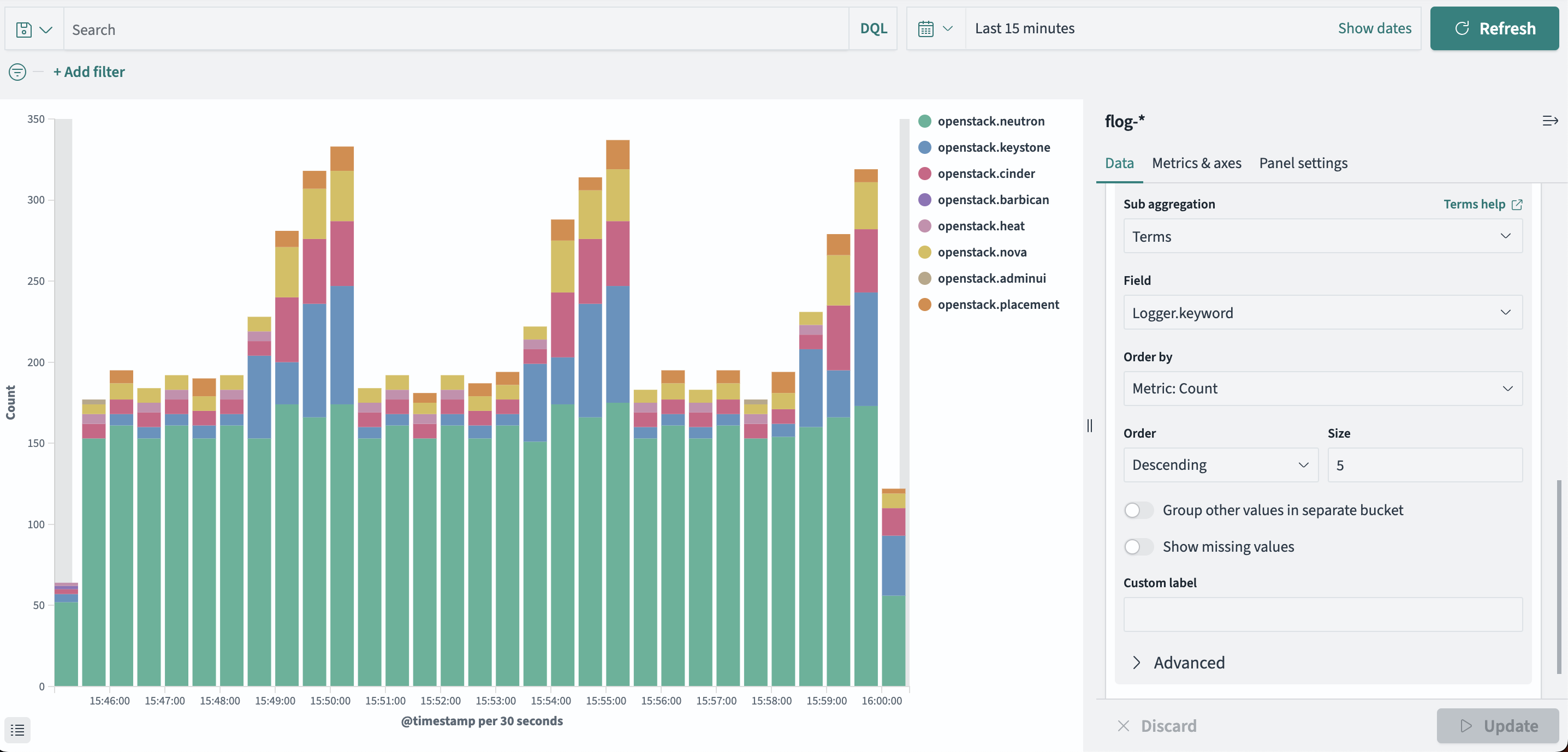 03-opensearch.conf:<match **> @type copy <store> @type opensearch hosts http://{{ opensearch_address }}:{{ opensearch_port }},https://адрес_нового_сборщика:порт_нового_сборщика {% if fluentd_opensearch_path != '' %} path {{ fluentd_opensearch_path }} {% endif %} {% if fluentd_opensearch_scheme == 'https' %} ssl_version {{ fluentd_opensearch_ssl_version }} ssl_verify {{ fluentd_opensearch_ssl_verify }} {% if fluentd_opensearch_cacert | length > 0 %} ca_file {{ fluentd_opensearch_cacert }} {% endif %} {% endif %} {% if fluentd_opensearch_user != '' and fluentd_opensearch_password != ''%} user {{ fluentd_opensearch_user }} password {{ fluentd_opensearch_password }} {% endif %} logstash_format true logstash_prefix {{ opensearch_log_index_prefix }} reconnect_on_error true reload_connections false reload_on_failure true request_timeout {{ fluentd_opensearch_request_timeout }} suppress_type_name true ssl_verify false <buffer> @type file path /var/lib/fluentd/data/opensearch.buffer/openstack.* flush_interval 15s chunk_limit_size 10M </buffer> </store> </match>
