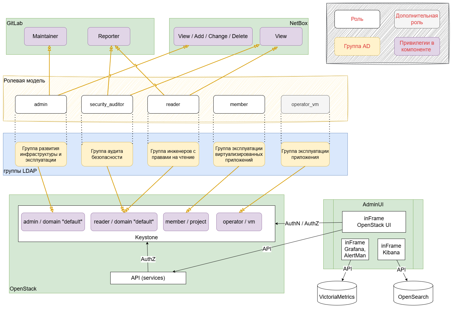 Роли KeyStack получают различные привилегии в компонентах платформы. Например, роль admin KeyStack соответствует роли Owner в GitLab, а роль reader — роли Reporter.